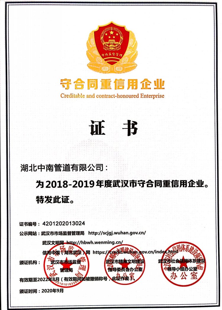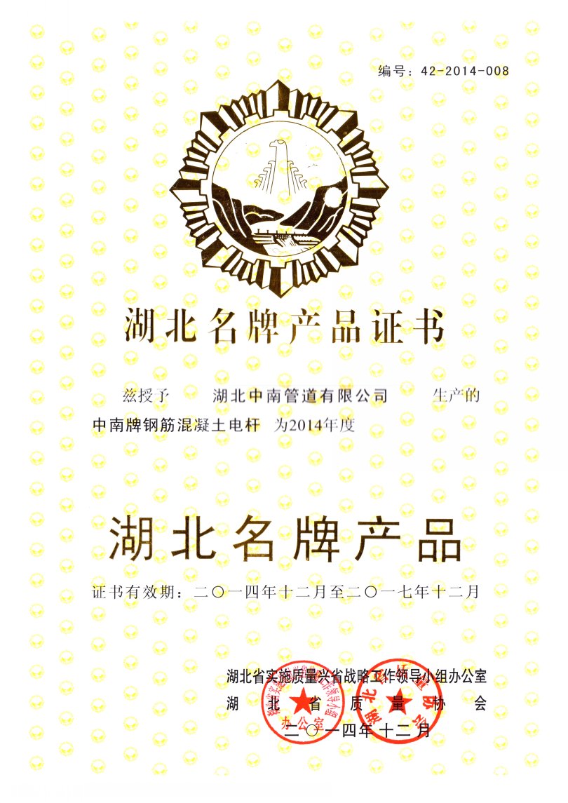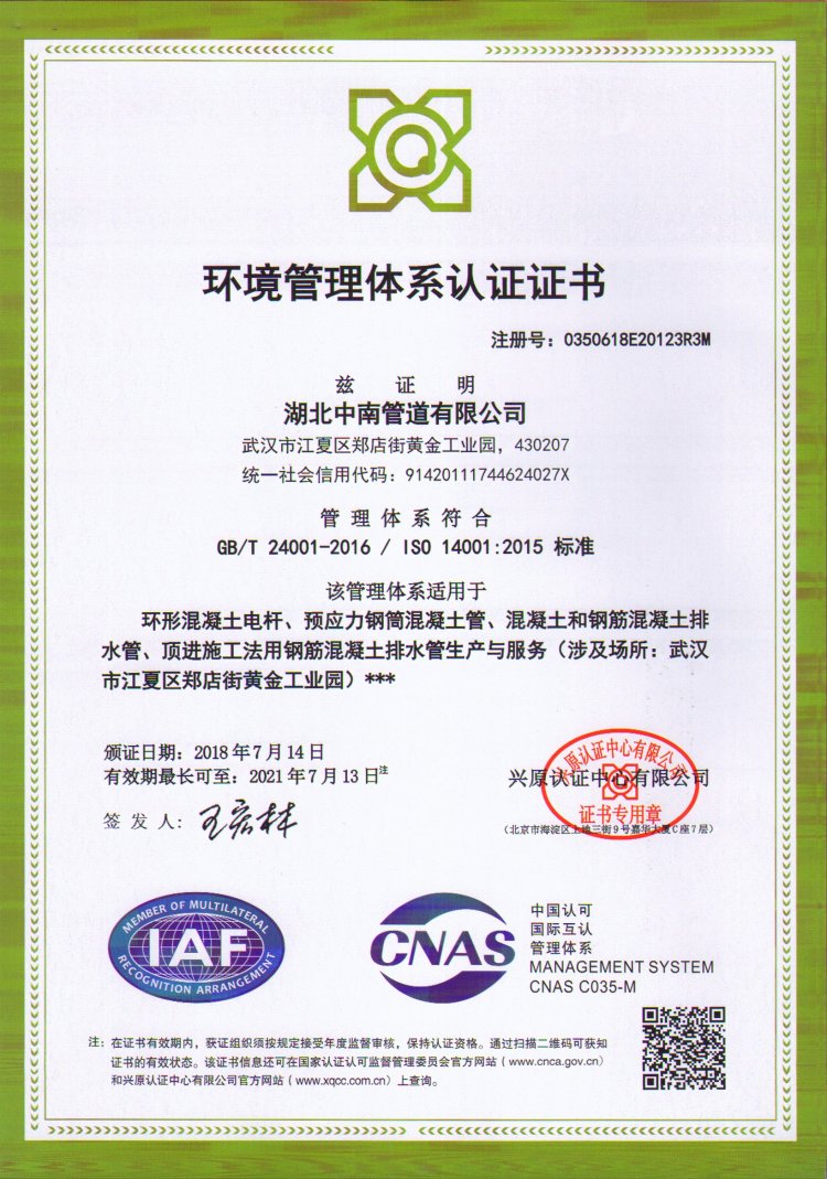 湖北中南管道有限公司始建于1952年,原屬國家建材部直屬企業,是國家三大水泥制品骨干企業之一。曾為中國第一座長江大橋——武漢長江大橋生產特制大橋桿;為馬耳他等國援建多座水泥制品廠;首創的國內環形力混凝土電桿和三階段混凝土壓力管榮獲1978年全國科技大會科研成果獎及優秀產品獎。公司現有資產規模億元,擁有25項實用新型專利、3項發明專利,是國家大力支持和發展的高新技術企業。主要生產環形混凝土電桿、預應力鋼筒混凝土管、鋼筋混凝土排水管、頂進施工法用鋼筒混凝土管、預制混凝土箱涵、鋼筋混凝土異形管等產品,是《環形混凝土電桿》、《預應力鋼筒混凝土管》、《混凝土和鋼筋混凝土排水管》、《預制混凝土箱涵》、《異形鋼筋混凝土異形管》、《混凝土和鋼筋混凝土排水管試驗方法》、《管廊工程用預制混凝土制品試驗方法》等國家標準的參編單位,目前擔任全國混凝土與水泥制品協會常務理事單位、湖北省混凝土與水泥制品協會會長單位。